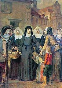 Recognizing the need for a new type of religious community – one that was “open to the world” and not confined to cloistered monasteries – Louise and Saint Vincent de Paul co-founded the Daughters of Charity of Saint Vincent de Paul on November 29, 1633. The Daughters of Charity were unlike the established Religious Communities at the time; up to this point all religious women were behind cloister walls and performed a ministry of contemplative prayer.  In working with her sisters, Louise emphasized a balanced life, as Vincent de Paul had taught her.  It was the integration of contemplation and activity that made Louise’s work so successful.  She wrote, “Certainly it is the great secret of the spiritual life to abandon to God all that we love, by abandoning ourselves to all that He wills”.   This innovative community of women committed themselves to serving the sick, poor, and neglected, living simple annual vows and working directly among those in need. Louise became the first Superior of the Daughters of Charity, dedicating herself to their formation, training, and spiritual guidance.